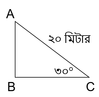 প্রশ্ন: ২০ মিটার দীর্ঘ একটি মই ভূমির সাথে ৩০° কোণে হেলান দিয়ে একটি দেয়ালের ছাদ স্পর্শ করে। দেয়ালটির উচ্চতা কত?
