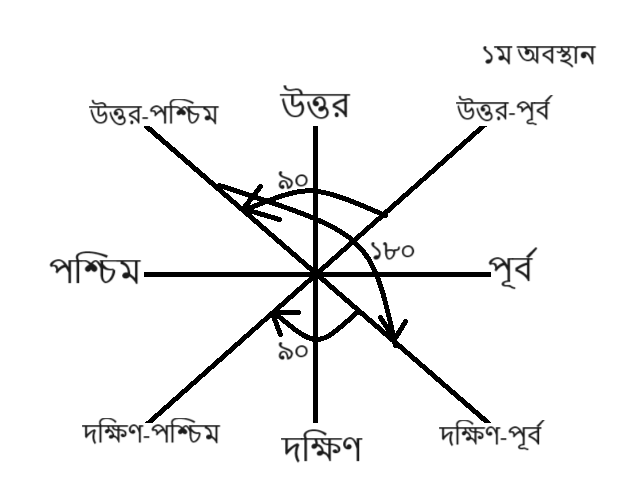 প্রশ্ন: একজন লোক উত্তর-পূর্ব দিকে মুখ করে আছে। সে ঘড়ির কাঁটার বিপরীত দিকে ৯০° ঘুরে, তারপরে ঘড়ির কাঁটার দিকে ১৮০° ঘুরে এবং তারপর একই দিকে আরো ৯০° ঘুরে। এখন সে কোন দিকে মুখ করে আছে? সমাধান: - লোকটি প্রথমে উত্তর-পূর্ব দিকে মুখ করে ছিলো।- ঘড়ির কাঁটার বিপরীত দিকে ৯০° ঘুরে উত্তর- পশ্চিমে মুখ করে ছিলো।- তারপরে ঘড়ির কাঁটার দিকে ১৮০° ঘুরে দক্ষিণ-পূর্ব দিকে মুখ করে ছিলো।- তারপর একই দিকে অর্থাৎ ঘড়ির কাঁটার দিকে আরো ৯০° ঘুরে দক্ষিণ-পশ্চিম দিকে মুখ করে ছিলো।