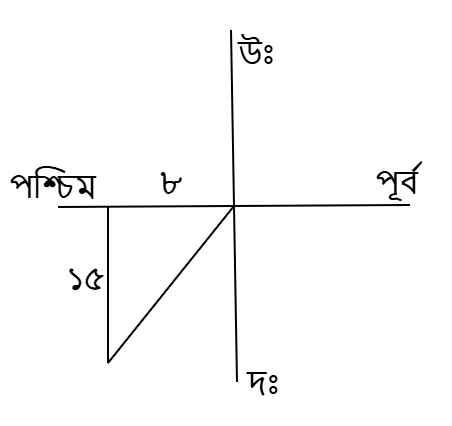 প্রশ্ন: মশিউর তার বাড়ির সামনের একটি নির্দিষ্ট বিন্দু থেকে উত্তর দিকে ৮ কি.মি হেঁটে গেলো এবং অতঃপর পূর্বদিকে ১৫ কি.মি দৌড়ে গেলো। যাত্রা শুরুর স্থান থেকে সে এখন কত দূরত্বে আছে?
