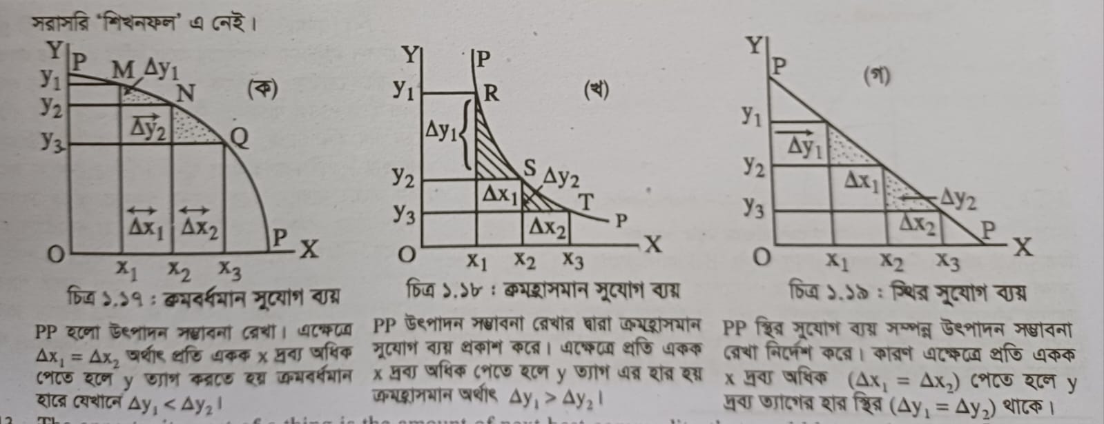 এখানে প্রথম চিত্রে উৎপাদন সম্ভাবনা রেখাটি অবতল আকৃতির, তাই সুযোগ ব্যয় ক্রমবর্ধমান।